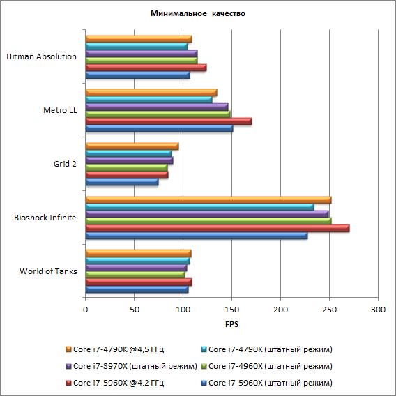 То, что даже при настройках на максимальное качество все игры продемонстрируют комфортный уровень производительности (выше 40 FPS), было очевидно изначально — все-таки речь идет о самых мощных процессорах и самой мощной видеокарте. Показательным в данном случае является тот факт, что в играх восьмиядерный процессор Core i7-5960X не имеет никакого превосходства над шестиядерными процессорами и даже над четырехъядерным Соrе i7-4790K. Более того, без разгона Core i7-5960X обеспечивает даже более низкий уровень производительности в играх (при настройках на максимальное качество) в сравнении с конкурентами. (Исключение составляет лишь игра Metro LL, где при настройках на максимальное качество результаты для всех процессоров практически одинаковы.)