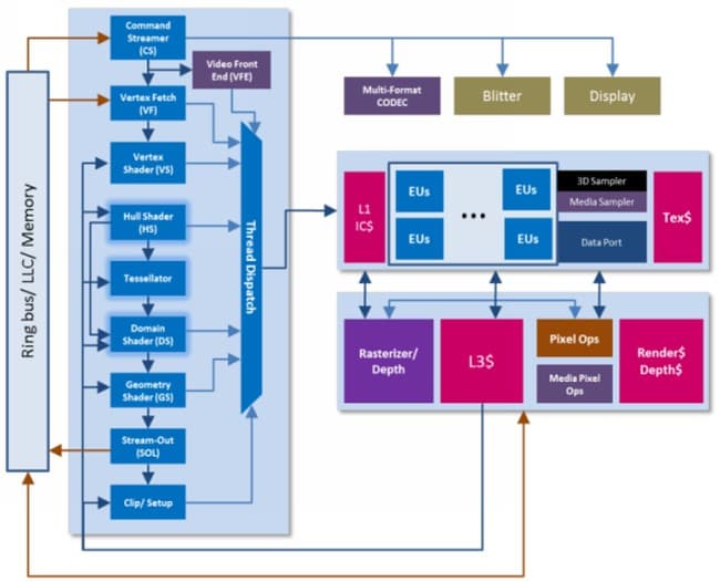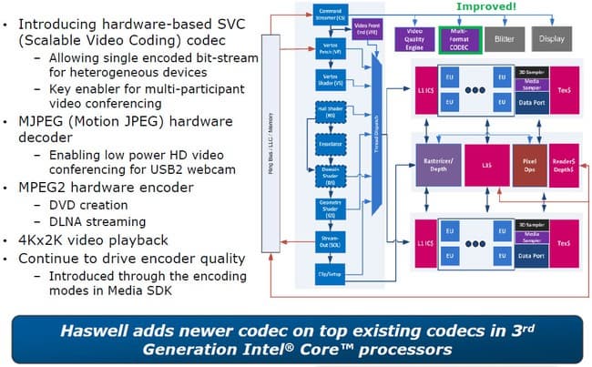 С переходом на IB графические ускорители, помимо увеличения количества графических ядер, получили второй текстурный семплер, кэш L3, увеличенные объемы текстурных кэшей L1 и L2. В Haswell архитектурные изменения в основном заключались в увеличении количества графических процессоров, добавлении новых исполнительных блоков, таких как Video Quality Engine (VQE) и Resource Streamer, а также усовершенствовании старых блоков — Texture Sampler, Multi Format Codec. Стоит заметить, что и компоновка исполнительных модулей (EU) изменилась — ранее 16 EU вытягивались в длинную цепочку, теперь же EU располагают сверху и снизу блоков растеризации и кэша L3, по 10 EU. Стоит заметить, что в модификации ядра GT3 не только происходит удвоение EU с 20 до 40, но и дублируется весь блок Slice Common, который содержит в себе блоки растеризации, кэш L3, блоки пиксельных операций. То есть происходит не просто наращивание количества конвейеров, но и удвоение других немаловажных блоков, таких как блоки растеризации, пиксельной обработки и рендера.