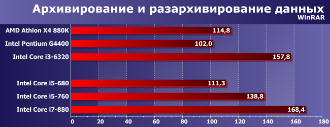 С учетом того, что Pentium G4400 уже нередко обгоняет Core i3 на базе Sandy Bridge, мы не удивились его превосходству над i5-680, да и к тому, что современные Athlon X4 способны не отставать от четырехъядерных Core i5 под LGA1156 тоже были готовы на основе чуть более ранних тестирований. Впрочем, они же привели к тому, что отставание одного из лучших некогда Core i7 (кстати — такие рекомендованные цены давно уже имеют только шестиядерные модели) от банального (пусть и лучшего в линейке) Core i3 нас тоже не слишком шокировало :) А ведь эта группа приложений — тот самый случай, когда количество поддерживаемых потоков вычисления по важности сравнимо с их качеством — дальше будет только хуже.