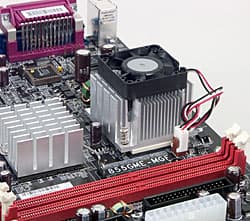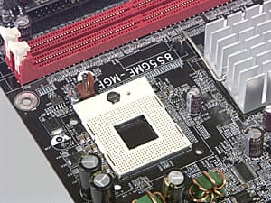 Сокет с установленным кулером, плата DFI 855GME-MGF.