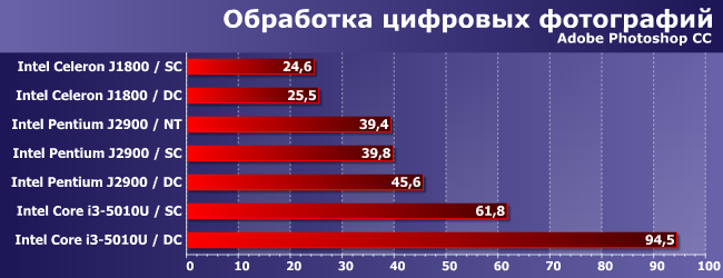 В конечном итоге приходим к тому, что Bay Trail двухканальный режим, в общем-то, и не нужен. Он хотя бы не мешает (а бывало и такое), но почти и не помогает. Вот для современных Core i3 (даже ультрабучных) это разница в быстродействии порядка 10%, что не так уж мало, хоть и тоже не принципиально. Однако заметим, что в данном случае речь шла только о процессорном быстродействии, а задействование графического ядра способно сильно изменить состояние дел, причем уже даже в приложениях общего назначения — приведенный выше пример Photoshop очень показателен. Впрочем, для Photoshop важна и емкость памяти, так что Pentium J2900 получил большее ускорение в этой программе, нежели Core i3-5010U в среднем.