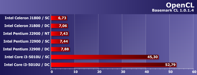 Для оценки производительности мы использовали нашу методику измерения производительности с применением бенчмарков iXBT Notebook Benchmark v.1.0 и iXBT Game Benchmark v.1.0. Все результаты тестирования в бенчмарке iXBT Notebook Benchmark v.1.0 мы нормировали относительно результатов Pentium G3250 с 8 ГБ памяти и SSD Intel 520 240 ГБ, а сама методика вычисления интегрального результата осталась неизменной. Еще одна программа, которую мы, как и в прошлые разы, добавили к тестовому набору — бенчмарк Basemark CL 1.0.1.4, созданный для измерения производительности OpenCL-кода.