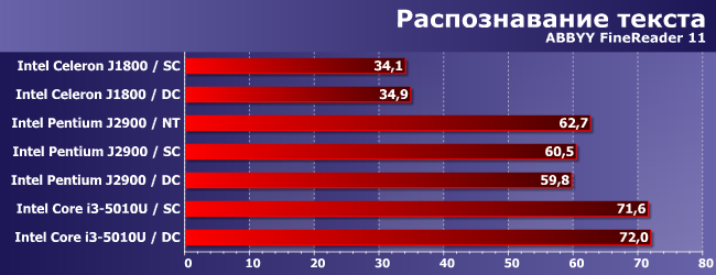 В некоторых же случаях влияние режима работы памяти становится сравнимым с погрешностью измерения, т. е. им тем более можно пренебречь. Что тут на самом деле забавно, так это то, что в задачах подобного рода экономичные четырехъядерные «атомные» процессоры способны почти на равных посостязаться с CULV-версиями Core i3, вообще говоря относящимися совсем к другому ценовому классу.