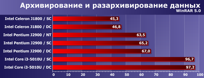 Как мы уже отмечали в обзоре Core i3-5010U, несмотря на то, что архиваторы традиционно считаются «жадными» до памяти приложениями, заметной разницы между одно- и двухканальным режимом найти не удалось. В этом нет ничего необъяснимого: скорость здесь зависит в первую очередь от задержек, а ПСП «достаточно» и при использовании одноканальной памяти. На медленных системах какая-никакая разница, впрочем, есть, но она не больше, чем между разными платами, например, т. е. по сути пренебрежимо мала.