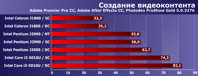 Но почему даже в Photoshop «лишние» 4 ГБ памяти обеспечили Pentium J2900 лишь 15% прироста быстродействия, а не 50%, как Core i3-5010U? Просто потому, что пользы от GPU в его случае немного. Собственно, это и в синтетических тестах иногда проявляется — на этом процессоре трассы PCMark8 быстрее «проигрываются» при отключении акселерации. В общем, медленное здесь графическое ядро, и на память оно почти не реагирует, что сильно мешает тем программам, которые умеют его использовать.