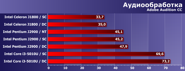 Этого, правда, не скажешь о работе в Audition: все три платформы продемонстрировали лишь 5% прироста при переходе от одного канала памяти к двум с пропорциональным же увеличением ее емкости. То есть нельзя сказать, что двухканальный режим работы совсем бесполезен, но для решения задач такого рода им можно и пренебречь.