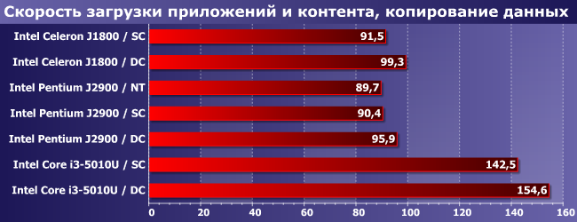 В общем, у нас есть результаты Celeron J1800, Pentium J2900 и Core i3-5010U, полученные с одним и двумя модулями памяти. Различалась в этих случаях как пиковая пропускная способность памяти, так и емкость — 4 и 8 ГБ соответственно. А все остальное — одинаковое. Вот и посмотрим, что при этом получается. И в качестве дополнения — Pentium J2900 с одним модулем памяти протестирован нами на обычной системной плате Mini-ITX (эти результаты на диаграммах обозначены как SC — Single Channel) и в составе мини-ПК (NT — от слова «неттоп», да и от названия конкретной модели неттопа тоже). Эти строчки тоже имеет смысл сравнить между собой.