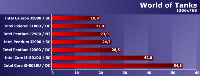 Что Bay Trail-D игровой платформой не может считаться даже из вежливости, известно априори, а то, что Core i3-5010U одноканальный режим работы в играх противопоказан, мы уже установили в его обзоре, поэтому сегодня ограничимся World of Tanks, благо требования этой игры к графической системе настолько невелики, что к ним близок даже упрощенный GPU Bay Trail.