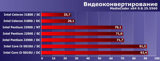 Изначально мы не ожидали в тесте перекодирования видео большого разброса результатов в каждой паре (тройке), и, в общем-то, в основном угадали. Исключением стал только Celeron J1800, однако связано это не с какими-то рациональными причинами, а просто с тем, что тест на таких системах выполняется очень уж медленно :) Приложение сильно «грузит» все ядра процессора и на более мощных системах, но в данном случае ресурсов просто уже начинает не хватать на фоновые процессы, которых за 20 с лишним минут «набирается» больше, чем за 5-10. Вот лишние 4 ГБ памяти, судя по всему, и позволяют системе немного «легче дышать», но не более того. Для самой же задачи четырех достаточно, да и вся работа выполняется в основном процессорными ядрами, так что разброс результатов между сходными системами (как в нашем случае — различающимися только платами) может быть больше, чем из-за различий в системе памяти.