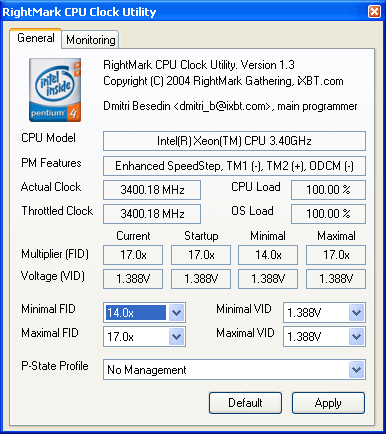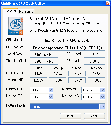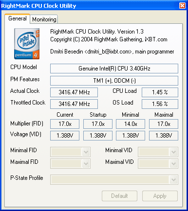 Весьма интересно проверить это на практике для этого берем процессор Pentium 4 с ядром Prescott (стенд №1) и запускаем утилиту RMClock.