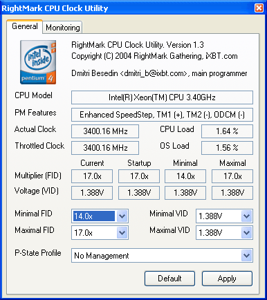 Запускаем RMClock в штатном режиме функционирования процессора. Последний, по всей видимости, оказался инженерным сэмплом, т.к. неправильно определился программой как Pentium 4 (Prescott) за счет отсутствия надлежащего значения Brand ID в данных CPUID (а другого прямого способа отличить Nocona от Prescott, в общем-то, не существует). Но гораздо более интересен набор поддерживаемых им «термальных фич» в нем присутствуют не только TM1 и ODCM (которые есть и в Prescott), но также TM2 и новая технология Enhanced SpeedStep (серверный вариант, как мы увидим ниже, отличный от его реализации в мобильных процессорах Pentium M). На момент запуска программы включены технологии TM1 и Enhanced SpeedStep (последний включается самой утилитой RMClock, а его функциональность будет рассмотрена ниже).