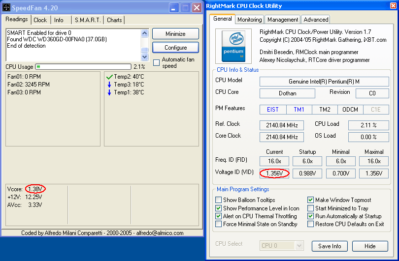 Для начала, запустим утилиту RMClock вместе со SpeedFan (для мониторинга напряжения на ядре процессора), чтобы увидеть настройки «как есть», то есть по умолчанию.