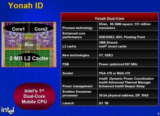 Основные характеристики двухъядерного процессора Yonah показаны на приведенном выше рисунке (на всякий случай уточним: по-русски это слово правильно произносится как «йона», а не «йонах», как это делают многие). На первый взгляд, новый процессор не содержит ничего особенного. Ожидаемый размер кристалла при переходе на технологические нормы 65 нм, ожидаемый общий кэш второго уровня размером 2 МБ, ожидаемое улучшение технологий энергопотребления. Тактовая частота тоже вполне ожидаемая — 2.16 ГГц сейчас и 2.33 во втором квартале. Однако если копнуть глубже, то можно увидеть, что Yonah имеет на удивление много важных микроархитектурных отличий от своего предшественника, процессора P-M на ядре Dothan. Информация о них появилась ещё на весеннем и осеннем форумах IDF-2005, но на фоне новостей о новой процессорной архитектуре Merom/Conroe она не была замечена и оценена по достоинству. Самое интересное, что ничто не предвещало таких изменений в микроархитектуре процессора для мобильных применений. Похоже, что компания Intel выбрала путь осторожного эволюционного развития существующей архитектуры P6+ (P-M), чтобы обкатать различные новшества перед внедрением их в процессоры следующего поколения Merom/Conroe. Вполне возможно, что эти новшества не внесут существенного вклада в увеличение производительности, поскольку они не затрагивают многие «слабые места» архитектуры процессоров P-III/P-M. Однако они касаются как раз тех подсистем процессора, которые представлялись «критическими» для будущей высокопроизводительной архитектуры и относительно которых делались различные предположения.
