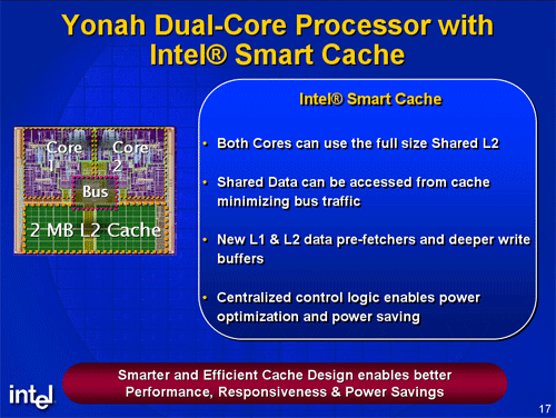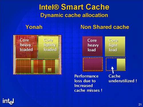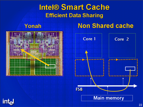 Таким образом, благодаря общему L2-кэшу, Yonah является первым высокоинтегрированным двухъядерным процессором архитектуры x86. В связи с начинающимся внедрением двухъядерных процессоров на массовый рынок требования к таким процессорам, а также к методам распараллеливания прикладных задач, должны повышаться. Появление процессоров с общим кэшем второго уровня должно привести к появлению новых методов программирования, обеспечивающих более высокую интеграцию выполняемых процессов и общее повышение скорости их исполнения.