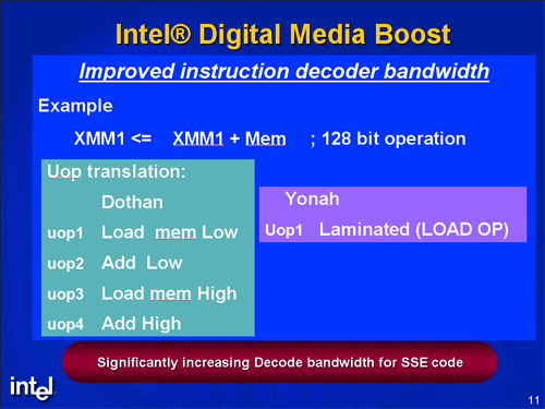 Наиболее радикальные изменения коснулись декодера инструкций в части обработки инструкций SSE. Как отмечалось в предыдущей статье, в процессоре P-M появился механизм слияния микроопераций (micro-ops fusion) при декодировании x86-инструкций, суть которого заключается в том, что в ряде случаев вместо двух микроопераций (МОПов) порождается одна (называемая иногда «макрооперацией»), содержащая два элементарных действия. В основном это относится к инструкциям загрузки из памяти с последующим исполнением (Load-Op), когда одна макрооперация замещает МОПы чтения из памяти и выполнения операции. Такая макрооперация расщепляется на два отдельных действия на более поздней стадии прохождения, непосредственно перед запуском на исполнение. Данный механизм похож на аналогичный в процессорах AMD K7/K8, где любой МОП может содержать в себе загрузку из памяти, либо выгрузку в память.