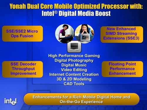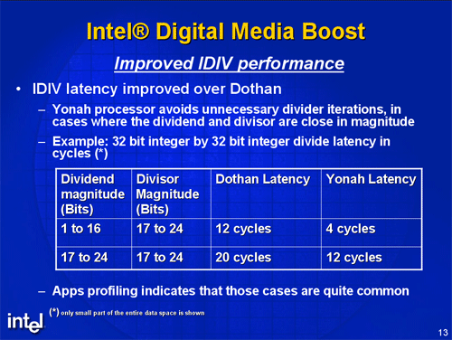 Судя по тому, что в рекламных материалах компании нет упоминания о таком усовершенствовании, можно считать, что эти операции выполняются по-прежнему медленно. С учётом этого предположения ситуация с производительностью нового процессора в плавающей арифметике напоминает ситуацию с процессором P-III на момент его появления: скорость 64-битной арифметики осталась невысокой из-за половинного темпа умножения (для P-III — в режиме x87, для P-M и P-M2 — x87 и SSE2), а весь упор сделан на повышение эффективности 32-битной арифметики (для P-III — через SSE, для P-M2 — также и через улучшение декодера, который перестал быть узким местом). Правда, следует отметить, что процессор P-III был многоцелевым, ориентированным на все сферы применения, а P-M2 (Yonah) — это процессор для мобильных применений.