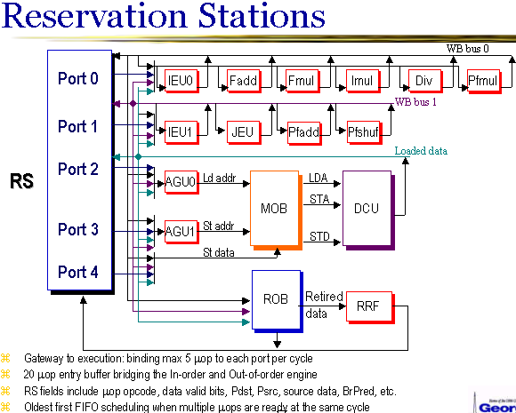 Другой недостаток микроархитектуры процессоров P-III и P-M проявляется в невозможности достижения 100-процентной скорости выполнения даже при оптимальном потактовом планировании машинных инструкций программистом или транслятором. Это связано, вероятно, со схемой организации очереди (буфера) микроопераций, из которой МОПы выбираются для исполнения в функциональных устройствах внеочередным образом, по мере готовности операндов (такой буфер обычно называют «Reservation station»). В других современных процессорах (Intel Pentium 4, AMD K8, IBM PPC970) имеется несколько таких очередей (буферов), по одной очереди на группу близких функциональных устройств. Благодаря этому в каждом такте происходит поиск и выборка для исполнения только одного МОПа из каждой очереди (буфера). В процессоре P-III имеется единый буфер на 20 элементов, и в каждом такте из него извлекается до пяти МОПов. По-видимому, это действие является слишком сложным и не всегда выполняется оптимально, в необходимом темпе. Результаты замеров процессоров P-M (Banias, Dothan) показывают, что у них в этой части изменений не произошло. Предполагается, что организация этого буфера в процессоре P-M2 (Yonah) также не изменилась.
