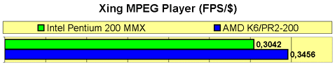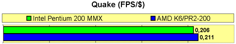 Здесь Pentium также оказался впереди в абсолютном измерении, значительно обогнав K6. Такое различие в результатах объясняется тем, что интеловский процессор имеет возможность выполнять операции с целыми и дробными числами одновременно, что используется в коде игры. В К6 такая возможность не реализована. Однако с выходом следующей версии К6+ эта проблема будет решена. Впрочем, если подсчитать кадры в секунду на доллар, то по этому показателю К6 и Pentium практически одинаковы.