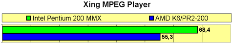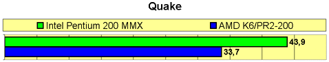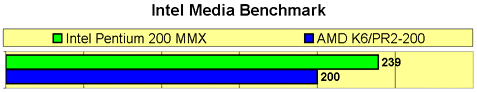 Для получения объективной картины были протестированы два аналогичных конкурирующих продукта Intel Pentium 200 MMX и AMD K6/PR2-200. Тестирование проводилось в системе с материнской платой EliteGroup P5TXBpro (с чипсетом i430TX) c 32 МБ памяти SDRAM, жестким диском Ouantum Fireball ST 2,1 ГБ и видеокартой S3 Virge/DX c 4 МБ EDO. Ниже приводятся результаты этого сравнения.