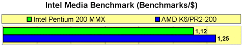 Здесь Pentium показал более высокие результаты в абсолютном измерении. Но характеристика Bench на $ у K6 выше: