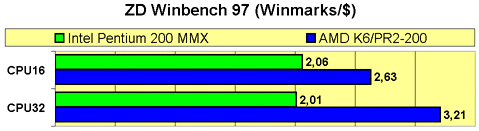 На основании этих данных сделать вывод о безоговорочном превосходстве Pentium нельзя, так как он превосходит K6 лишь по CPU16. К тому же существенный аргумент в пользу K6 — его цена. На момент написания этого материала она составляет $213 за процессор Intel Pentium 200 MMX и $160 за AMD K6/PR2-200 (приведены цены для дилеров после ноябрьского снижения). Если построить диаграмму в масштабе Bench на $, то есть разделив результат на стоимость, то превосходство K6 очевидно.