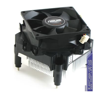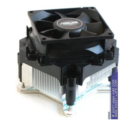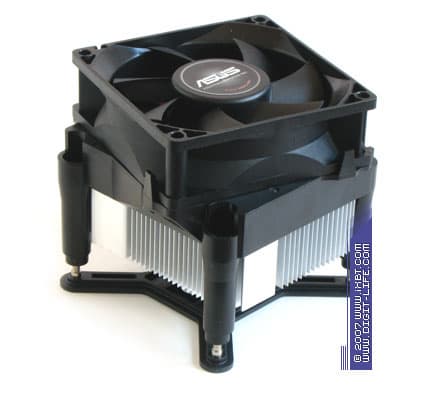 Впрочем, фирменное конфигурирование радиатора здесь по-прежнему присутствует, да и само оребрение сохраняет достойные термические параметры (ребро трапецеидального сечения, толщина 0,6 мм в основании, и 0,2 мм у вершины, средний шаг размещения 1,5 мм, общая площадь поверхности теплообмена порядка 1500 см2). Любопытна также конструкция пластиковой рамки, которая фиксирует вентилятор на радиаторе — она попутно снабжена двумя миниатюрными воздуховодами, устраняющими аэродинамическое неудобство «повернутой» диспозиции набортного вентилятора и восполняющими эффективный продув радиатора.