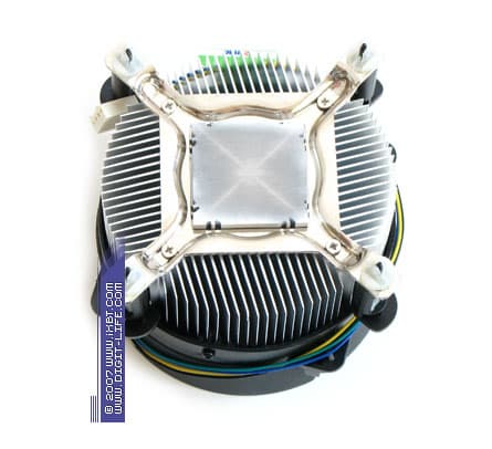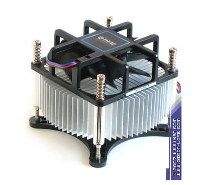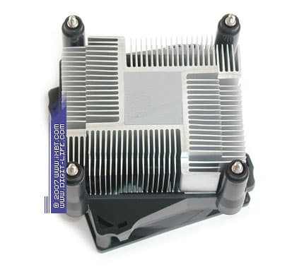 По сути, DC-775G825Z/N копирует конструктив родственной модели экономичного толка от Cooler Master — ICT-D925P-GP, и делает это почти дословно — имеем радиатор такой же структуры, только в еще более усеченном виде и с ухудшенными термическими параметрами (ребро прямоугольного сечения, толщина 0,8 мм, шаг размещения 3 мм, общая площадь поверхности теплообмена порядка 800 см2), и тот же винтовой крепеж весьма среднего технического качества. Единственное различие между ними заключается в набортных вентиляторах, но и оно играет не в пользу нашего подопытного — меньший типоразмер и открытая крыльчатка в здешних условиях явно не способствуют эффективному продуву радиатора.