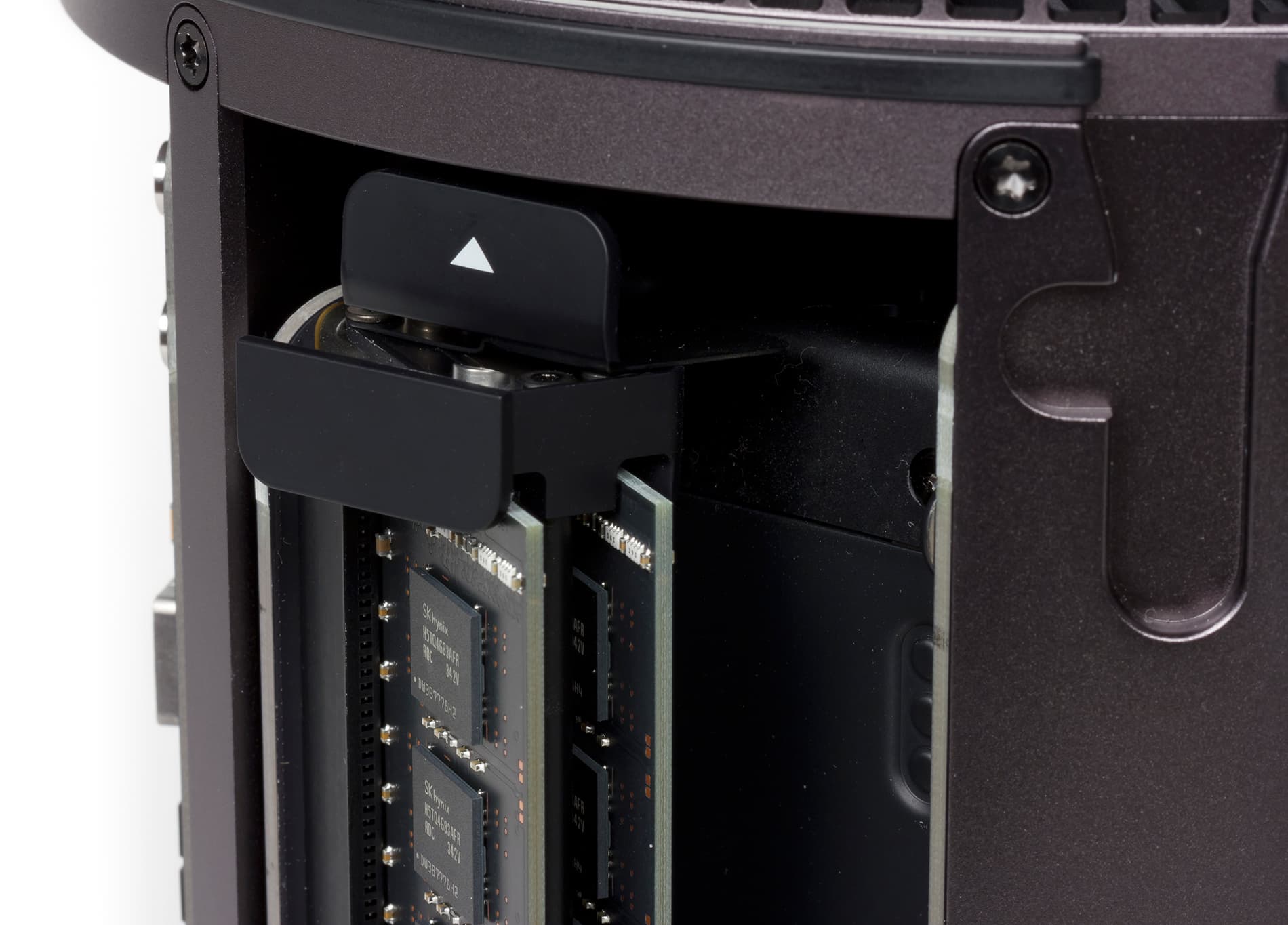 Ну и заканчивая описание дизайна Mac Pro 2013, отметим, что даже после снятия цилиндрического кожуха можно получить доступ лишь к модулям памяти (всего их можно установить четыре). А вот все остальное остается недоступным пользователю. Можно, конечно, раскрутить винты и попробовать произвести дальнейшую разборку, однако, во-первых, вы при этом лишаетесь гарантии, а во-вторых, это все равно ничего не даст, поскольку поменять что-либо в Mac Pro 2013 вне сервис-центра просто невозможно.
