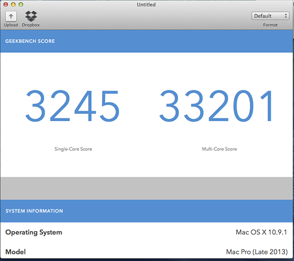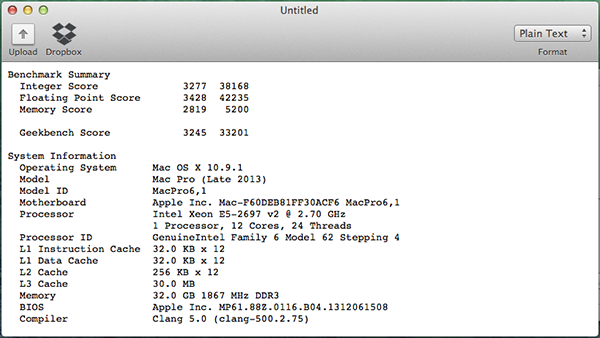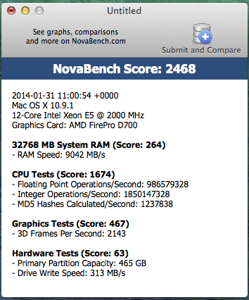 Для нашего тестового экземпляра Mac Pro 2013 с 12-ядерным процессором Intel Xeon E5-2697 v2 в тесте NovaBench 1.1 мы получили следующий результат: