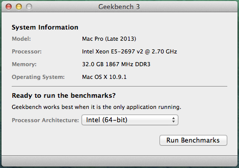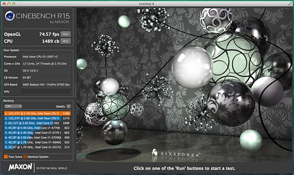 Нужно, правда, отметить, что специализированных бенчмарков для рабочих станций под OS X (как, кстати, и под Windows) просто нет, да и вообще разнообразия бенчмарков под OS X не наблюдается. Есть несколько синтетических тестовых приложений, но, как нам кажется, популярность этих бенчмарков объясняется не столько их адекватностью, сколько отсутствием каких-либо других. Что ж, отдавая дань традиции, мы также воспользуемся этими синтетическими бенчмарками (благо их совсем немного), однако еще раз отметим, что что их адекватность, особенно применительно к 12-ядерному процессору, вызывает сомнение.