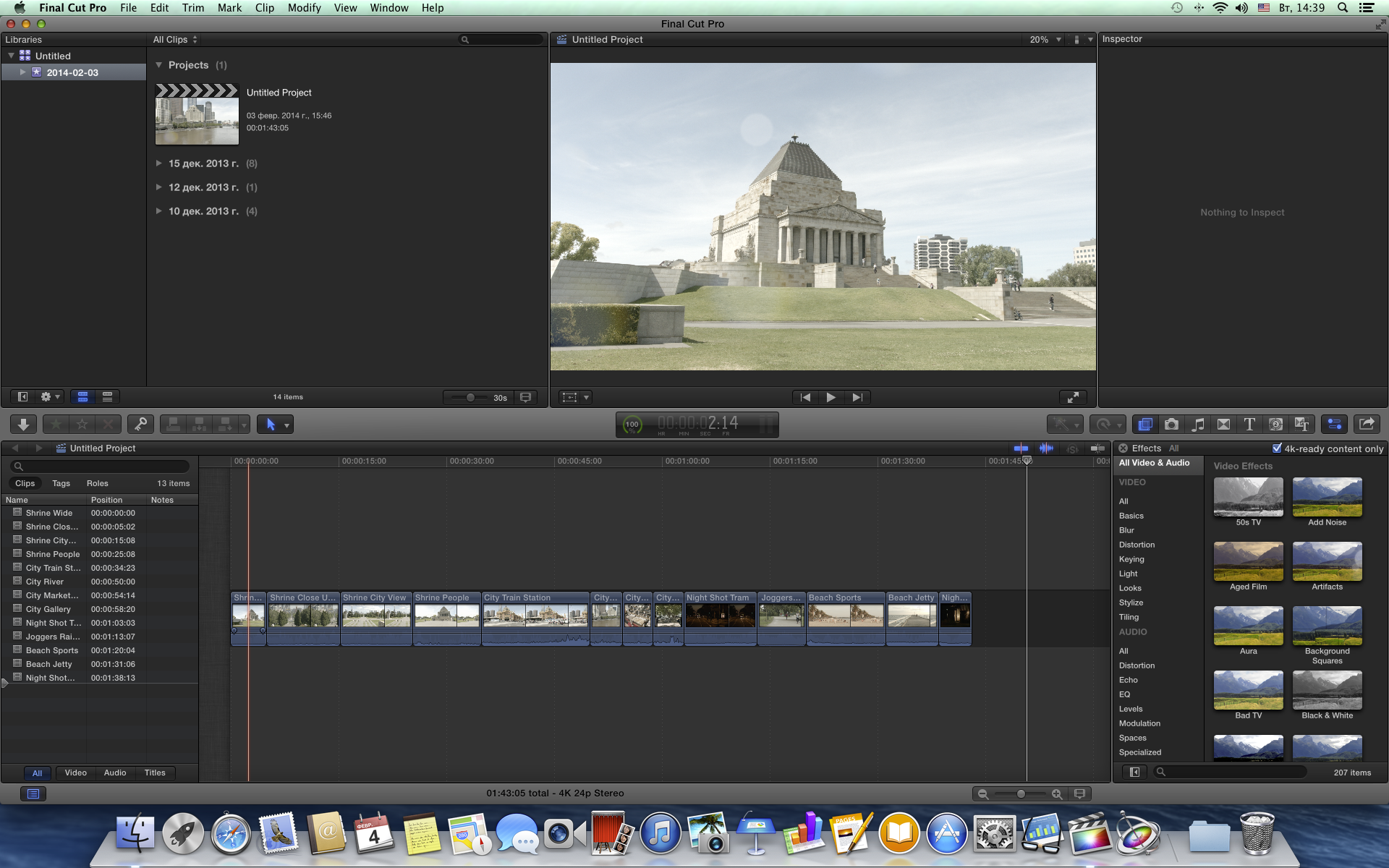 Для тестирования Mac Pro 2013 мы воспользовались приложением Final Cut Pro X 10.1.1, которое было предустановлено на нашем тестовом образце (напомним, что Mac Pro 2013 можно заказать с предустановленным приложением Final Cut Pro X). При тестировании мы отключили рендеринг в фоновом режиме (Background Render) и создали проект из 13 видеороликов с разрешением 4K суммарным объемом 9,2 ГБ.
