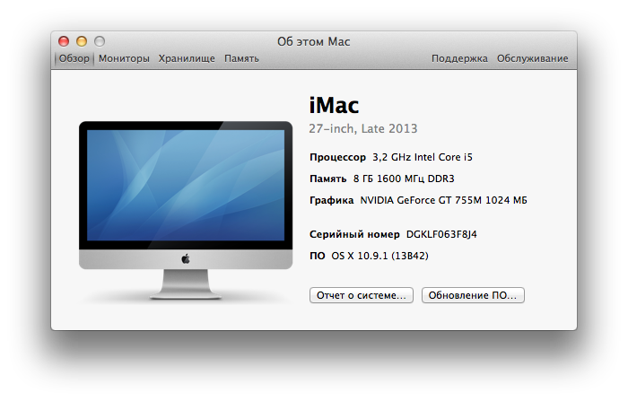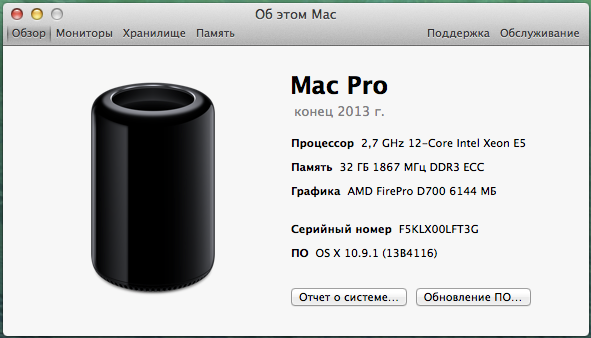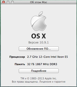 Ну и в заключение описания конфигурации Mac Pro 2013 отметим, что на всех моделях установлена операционная система OS X Mavericks 10.9.