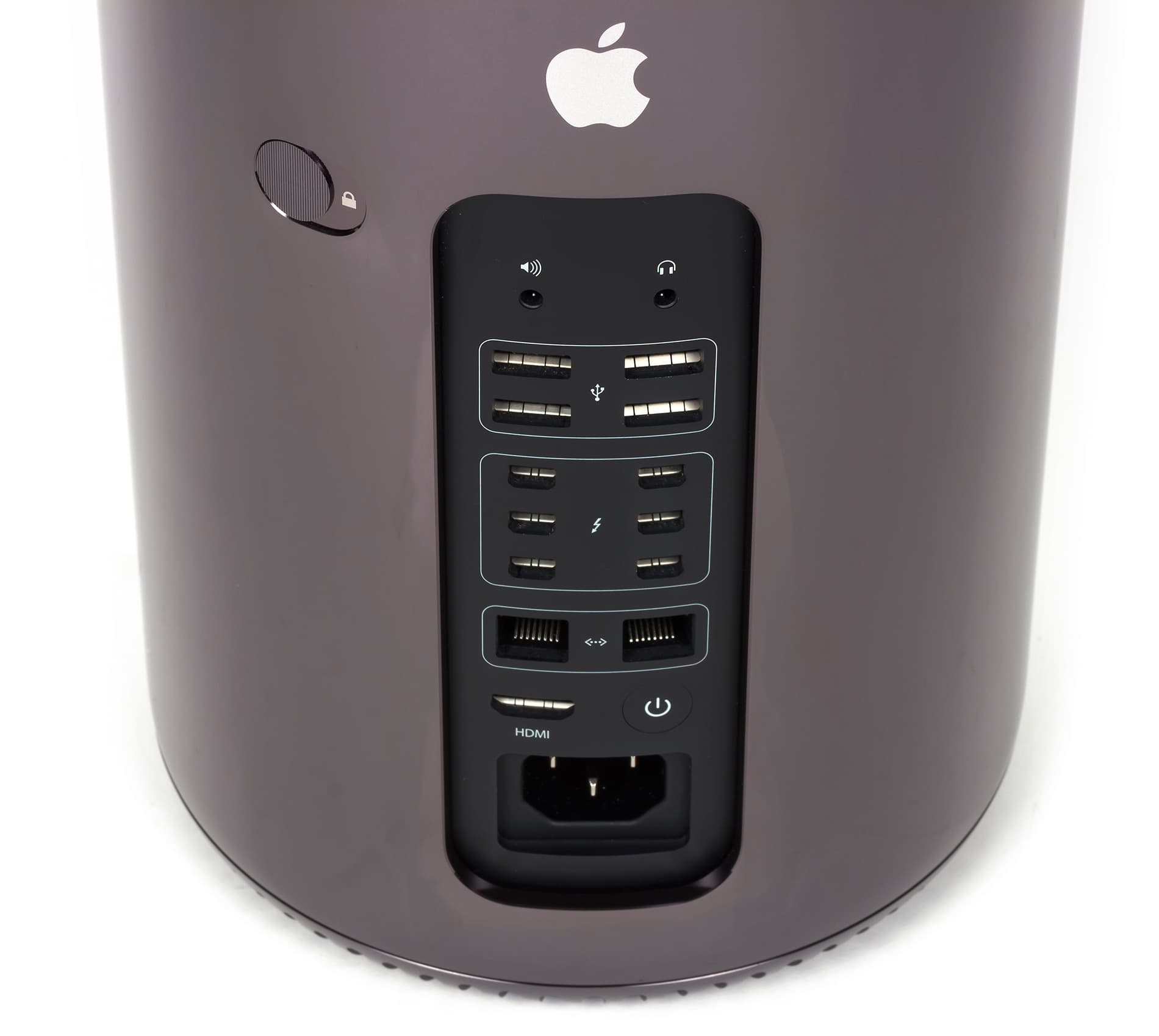Как мы уже отмечали, Mac Pro 2013 изобилует различными интерфейсами. Это и 4 порта USB 3.0, и 6 портов Thunderbolt 2, и два гигабитных сетевых порта, и порт HDMI 1.4. Ну и плюс к этому имеется один комбинированный аудиовыход типа миниджек (оптический цифровой и аналоговый) и один аудиовыход для наушников с поддержкой гарнитуры.