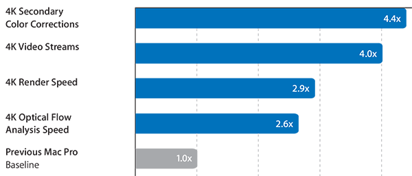 В данном случае новый Mac Pro с 12-ядерным процессором Intel Xeon E5 (2,7 ГГц), двумя видеокартами AMD FirePro D700, 64 ГБ DDR3 памяти и SSD-накопителем емкостью 1 ТБ сравнивается с Mac Pro предыдущего поколения, оснащенным 12-ядерным процессором Intel Xeon с тактовой частотой 3,06 ГГц, одной видеокартой ATI Radeon HD 5870, 64 ГБ DDR3-памяти и SSD-накопителем емкостью 512 ГБ. Как видим, преимущество нового Mac Pro очевидно.