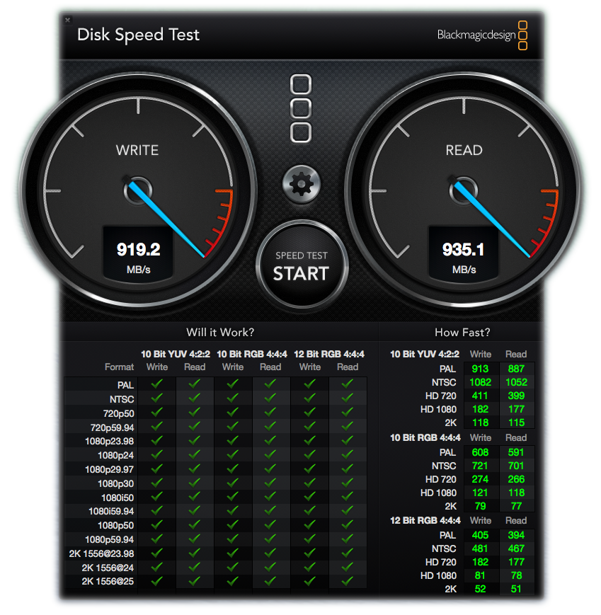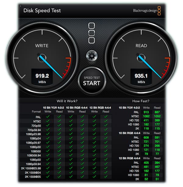 Ну и последний тест — Blackmagic Disk Speed Test 2.2, оценивающий производительность дисковой подсистемы. Результаты для SSD-накопителя с интерфейсом PCI Express x4 впечатляют: