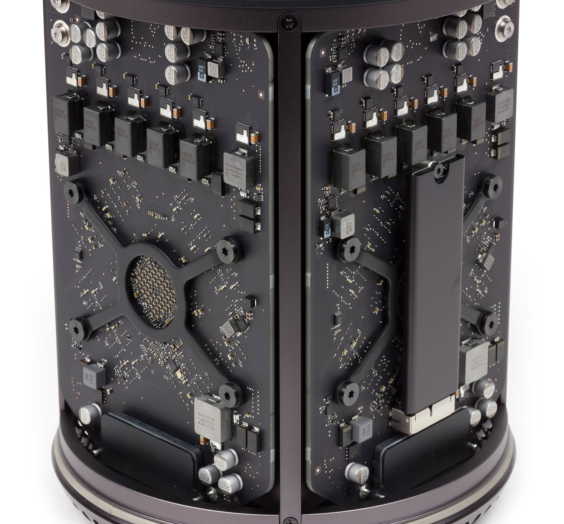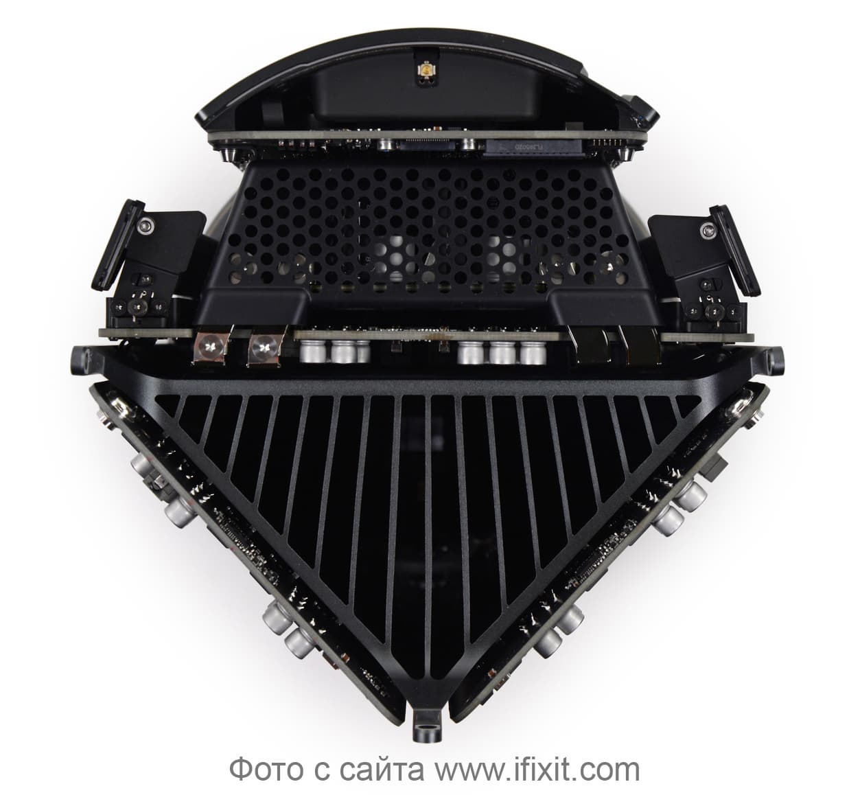 Со снятым кожухом становится понятно, в чем заключается секрет Mac Pro 2013. Здесь применяется не традиционное ортогональное размещение плат, а «треугольное»: две видеокарты и часть системной платы вместе с блоком питания мощностью 450 Вт расположены по граням правильной треугольной призмы. Еще одна часть системной платы расположена в основании всей конструкции.