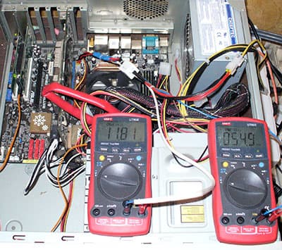 Ввиду того, что данный тип тестирования является новым для нашей тестовой лаборатории, мы сочли нужным включить в данный материал более подробное описание методики. Принцип измерения потребляемой мощности, в данном случае, основан на известном законе Ома, а именно I=dU/R (1). В нашем случае, силу тока (I), необходимую для вычисления потребляемой мощности, мы получаем, измерив падение напряжения (dU) на измерительном шунте сопротивлением (R) 0,025 Ом, после чего подставив имеющиеся значения в формулу (1) получаем действующее значение силы тока в амперах. После чего, воспользовавшись одной из старейших формул электротехники, а именно P=UI, мы вычисляем значение потребляемой мощности из разъема ATX12V. В нашем случае падение напряжения на шунте (dU) измеряет мультиметр, расположенный на фотографии справа, а действующее значение напряжения в цепи (U) – мультиметр слева. В ходе тестирования напряжения измеряются цифровыми TRMS-мультиметрами UT60E.