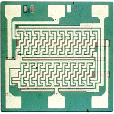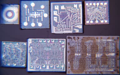 ![]() Кристалл первой «современной» микросхемы (1960 г.) — триггера с 4 транзисторами и 5 резисторами. |