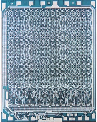 ![]() Кристалл 256-битной ТТЛ-памяти для процессора суперкомпьютера Illiac IV — двухмерная регулярность топологии очевидна. |