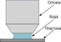 В 2006 г. появилось ещё одно улучшение — погружённая литография. Впрочем, в крайне неустойчивой и неполной русскоязычной терминологии по странной традиции прижилась транслитерированная форма оригинала — иммерсионная литография. Суть оной в том, что пространство между последней линзой и экспонируемой пластиной заполняется не воздухом, а жидкостью (на данный момент — водой). Это улучшает разрешение на 30–40% ввиду большего преломления жидкости, которое влияет на вышеуказанный параметр NA, равный 1 для воздуха и 1,33 для воды. Intel внедрила иммерсионную литографию вместо «сухой» с техпроцесса 32 нм, а AMD — ещё с 45 нм. Интересно, что первые «водные» сканеры появились ещё в 2005 г., но техпроцессы с ними пришлось дорабатывать около года после внедрения на фабах до применения в массовом производстве. И вот почему: