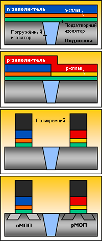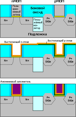 ![]() Устройство 45-нанометрового p-канального транзистора в микросхемах Intel. Тут не указано присутствие в затворе слоя металла для n-канального транзистора. |