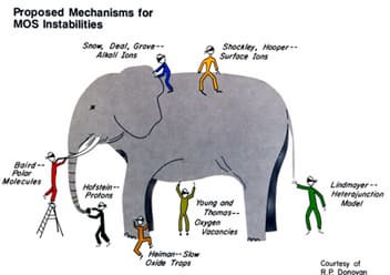 Когда массовое производство ИС стало исчисляться уже миллионами, оказалось, что с применением пластин большего диаметра себестоимость чипов падает, а массовость растёт — и в 1964 г. введены 25 мм пластины, а через 2 года — на 38 мм. Однако уменьшать интегральные МОП-транзисторы оказалось труднее, чем биполярные, из-за производственных сложностей и падения надёжности. Причём эксперты чуть ли не соревновались по добавлению очередного аргумента в ряд «почему оно не будет работать» — так что это даже вылилось в пародию на известную индийскую притчу о слепцах, ощупывающих слона по частям, чтобы изучить его. В течение 1963–66 гг. специалисты из американских, европейских и японских компаний (в сотрудничестве и конкуренции) исследовали и решили бо́льшую часть вопросов надёжности МОП-схем.