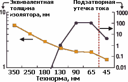 ![]() Графики толщины подзатворного изолятора в SiO2-эквиваленте и относительной утечки тока. Введение высокопроницаемых изоляторов для техпроцесса 45 нм позволило уменьшить эквивалентную толщину, увеличив физическую, чтобы уменьшить утечки для увеличения скорости. |