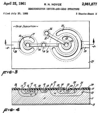 ![]() Патент Нойса на планарную ИС. Тут все контакты находятся уже по одну сторону от кремниевой пластины. |
