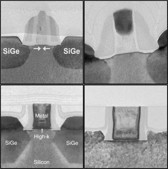 ![]() 4 последних поколения транзисторов Intel (слева направо, сверху вниз) — 90 (2003 г., первое применение напряжённого кремния), 65 (2005), 45 (2007, первое применение комбинации HKMG) и 32 (2009) нм. | |