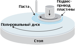 ![]() Химико-механическая планаризация: вращающийся подвес прижимает пластину лицевой стороной к вращающемуся диску с наносимой на него пастой. Специальный диск-восстановитель (не показан) выравнивает пасту. Восстановитель и подвес также могут двигаться вдоль радиуса. |