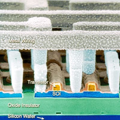 ![]() КНИ в чипе IBM (для наглядности пространство между проводниками вытравлено). Снизу вверх: подложка, оксид-изолятор, тонкий слой кремния, транзисторы и один слой металлических межсоединений с опущенными до транзисторных выводов металлизированными окнами. |