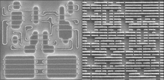 ![]() 65-нанометровые транзисторы (слева) могли себе позволить такие роскошества как двунаправленные дорожки (вертикали и горизонтали) и переменные размеры затворов и их шагов. Для 32-нанометрового техпроцесса (справа) всё это запрещено. | |
