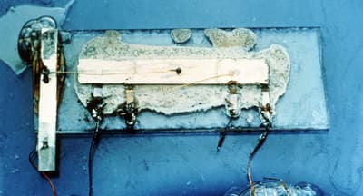 ![]() Кристалл первой «современной» микросхемы (1960 г.) — триггера с 4 транзисторами и 5 резисторами. |