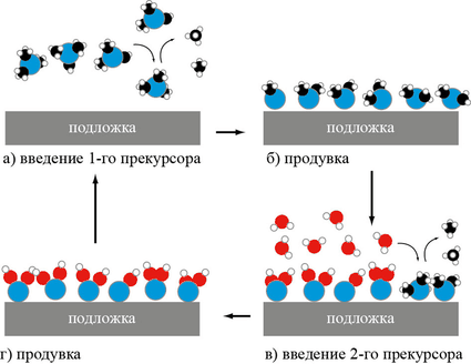 ![]() 4 стадии цикла молекулярного наслаивания AlO2. Алюминий (синие атомы) поставляет 1-й прекурсор, валентные связи которого заняты лигандами (временными радикалами, в данном случае метильными группами —CH3). 1-я продувка удаляет метан (CH4) и избыток прекурсора. Вторым прекурсором является вода, замещающая остальные два лиганда у каждого атома Al. 2-я продувка удаляет лишнюю воду и метан. В следующем цикле атомы водорода 1-го слоя будут замещены связью с Al 2-го слоя, восстановив свободные метильные группы до метана. |